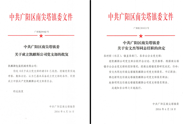 2016年8月10日,經(jīng)廊坊市廣陽區(qū)南尖塔鎮(zhèn)黨委宣布,凱麒斯公司黨支部正式成立,支部書記由安文杰同志擔(dān)任。